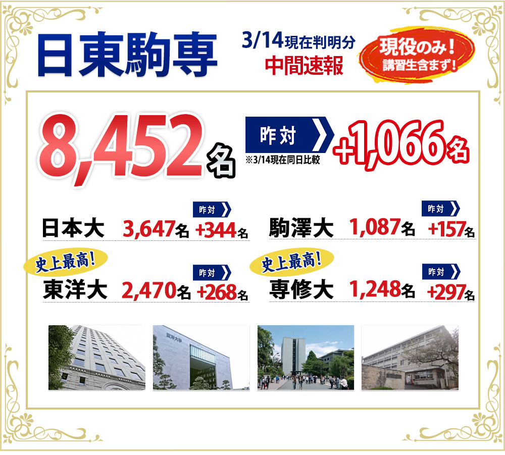 また、東進には合格が判明した東進生がゾクゾクと校舎に報告に来てくれるという伝統があり、3月末にはほぼ全員の結果が判明します。これは、私どもと生徒との信頼関係の強さの結果であり、高卒生や講習生を含んだ合格実績を秋以降に発表する多くの予備校とは大きく異なります。